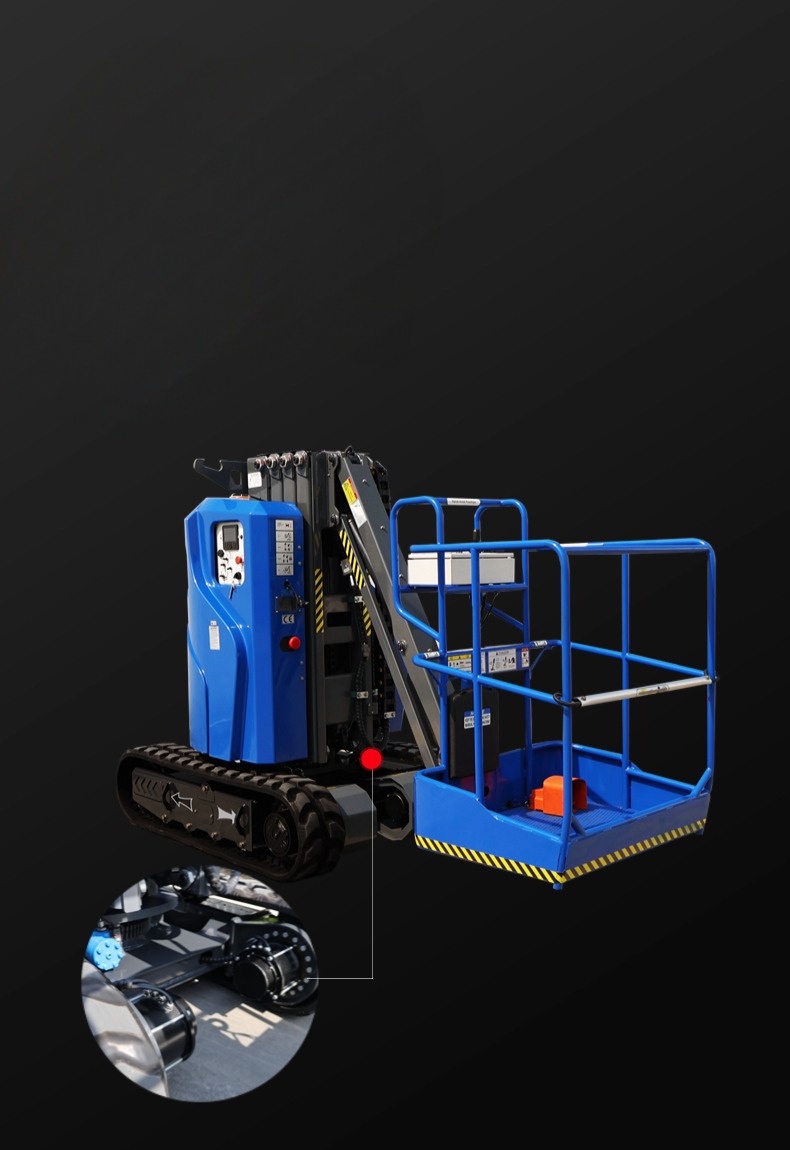 A: A self-propelled aerial work platform with a tracked chassis and a vertical mast as the lifting mechanism, integrating travel, lifting, and operation.